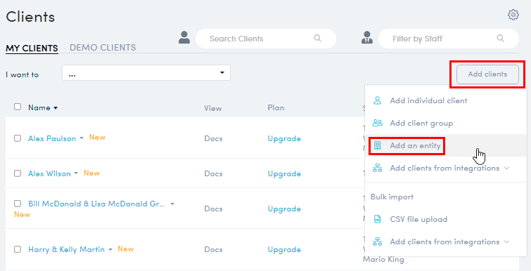 - Navigate to the Client list and select 'Add Clients'>'Add an entity'