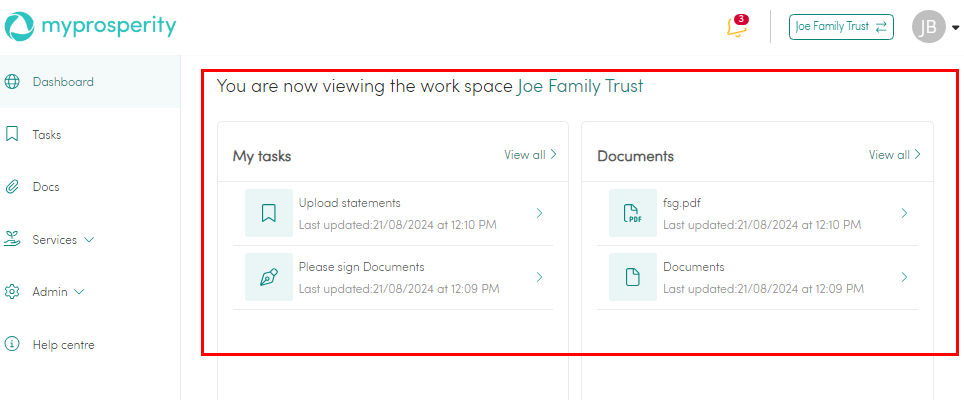 By sending documents and tasks to the entity's workspace, the entity can be clearly separated from the individual's portal, allowing for greater organisation and visibility over specific tasks.